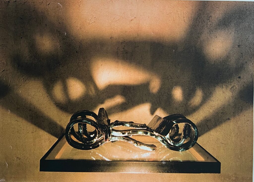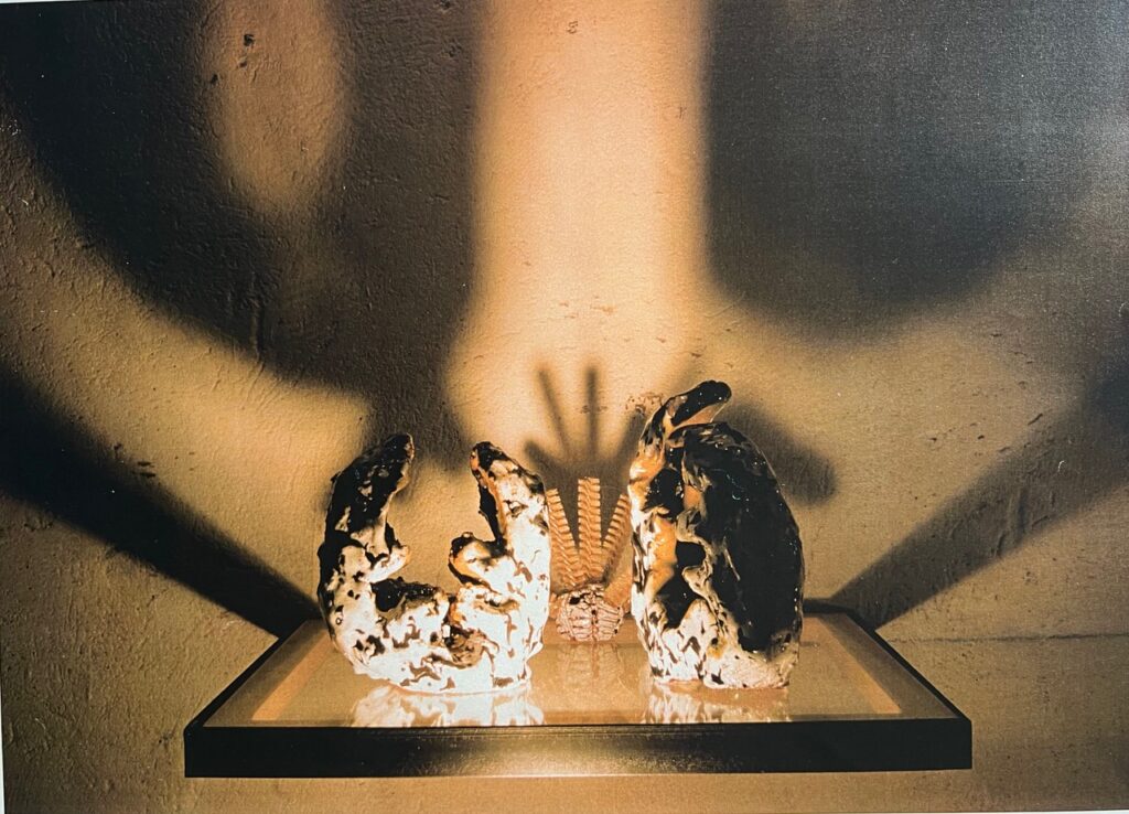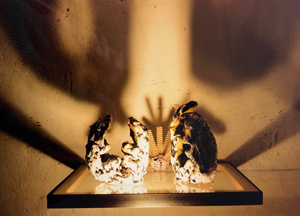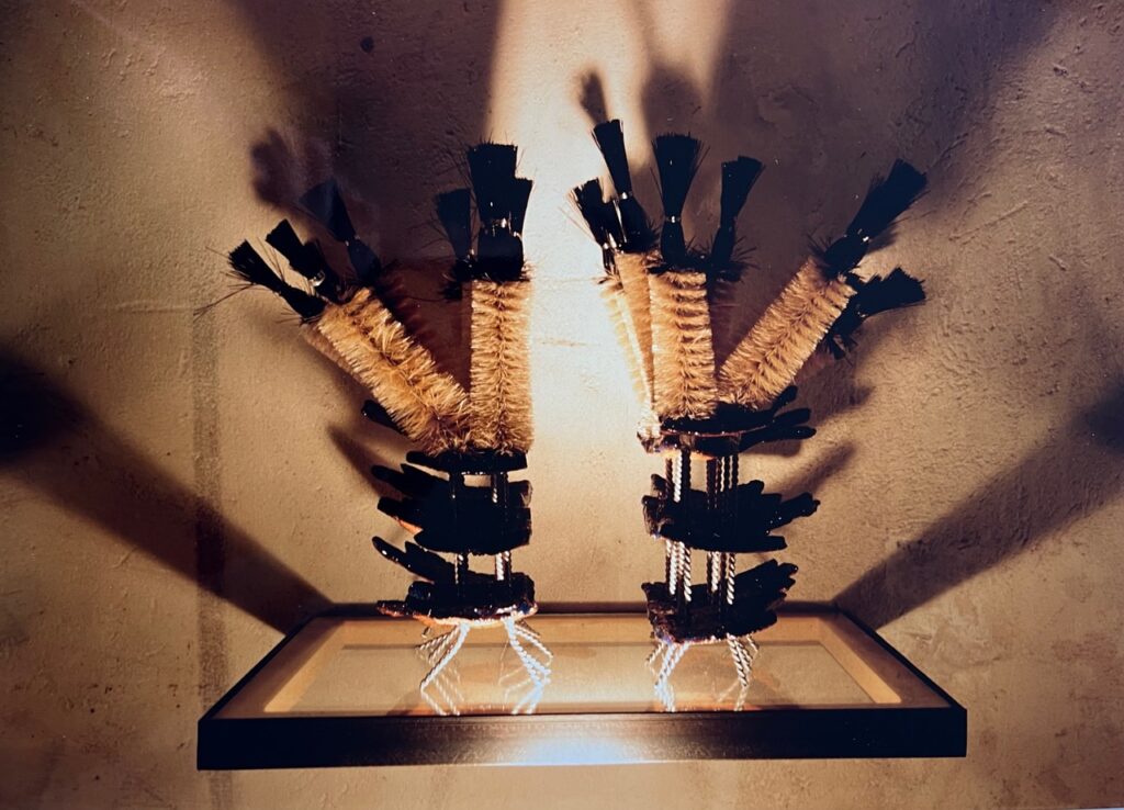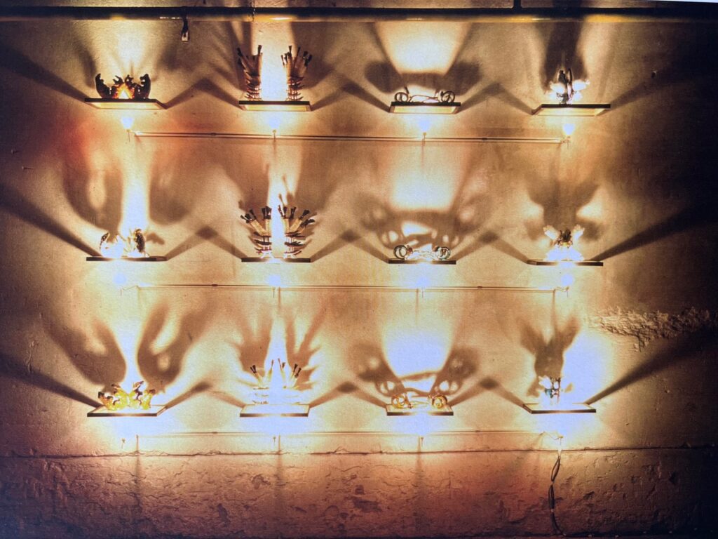 This is a wall with sculptures made for the shadow of them. The separate sculptures are made with ceramics and bottle brushes. They are placed on a glass plate with a light underneath.